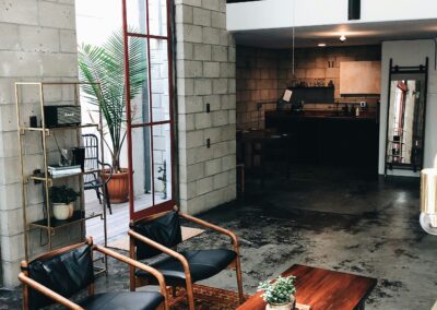 - Mobilier : en bois léger et lignes fines, ou brut massif